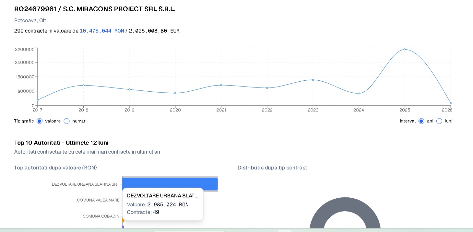 Datele publice relevă că societatea lucrează aproape exclusiv cu Dezvoltare Urbană Slatina. În ultimele 12 luni, între cele două părţi au fost încheiate 49 de contracte în valoare totală de 2.986.024 lei.