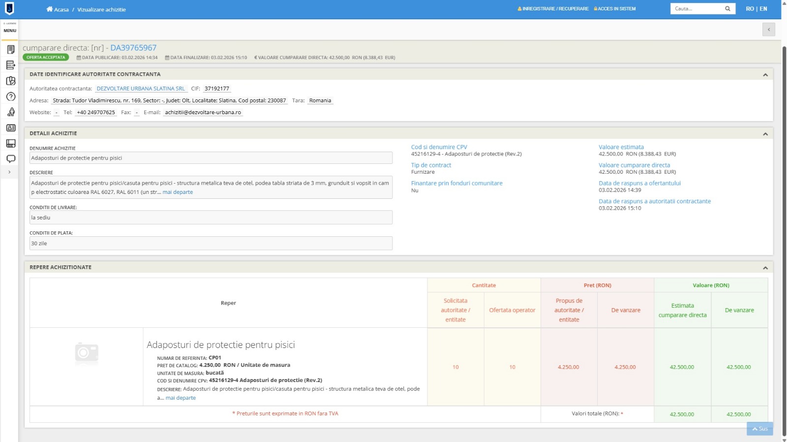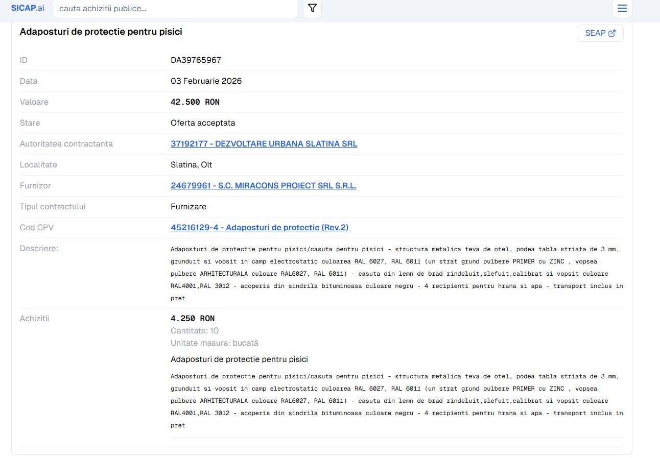 Actualul primar al Slatinei, Mario De Mezzo, a pozat în iubitor de animale printr-un clip postat marţi pe conturile sale de social media, arătând că Primăria , prin firma DUS a montat în oraş adăposturi pentru pisici.. Ceea ce nu a spus liberalul este preţul incredibil pe care Dezvoltare Urbană Slatina l-a plătit pe un singur astfel de adăpost. Potrivit datelor din portalul SICAP, un singur adăpost a costat 4.250 lei, iar societatea Primăriei a achiziţionat un prim lot de zece bucăţi, în data de 28 ianuarie, iar la începutul acestei săptămâni a mai achiziţionat încă 10.