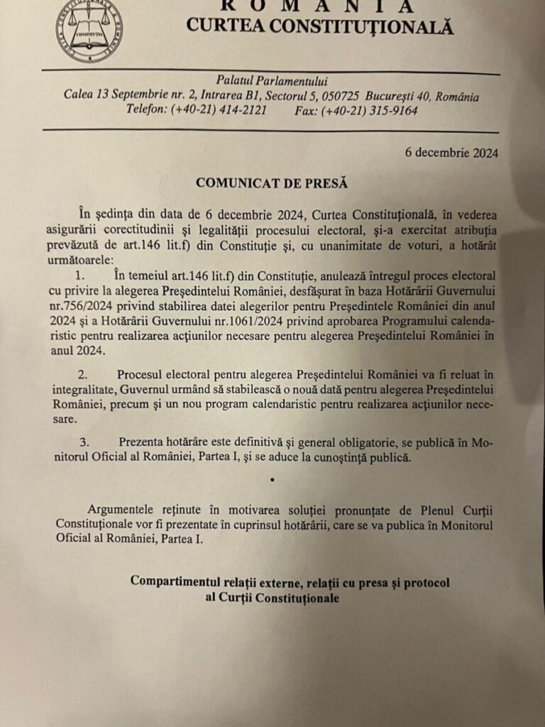 Curtea Constituțională a anulat vineri alegerile prezidențiale, au declarat pentru G4Media surse oficiale. Nu e clar dacă turul 1 se va relua cu aceeași listă de candidați. Potrivit unei surse, anularea alegerilor vizează întreg procesul electoral. Altfel spus, alegerile vor fi luate de la zero, candidații trebuind să se înscrie din nou și trebuind să treacă prin procesul de validare de la Biroul Electoral Central.