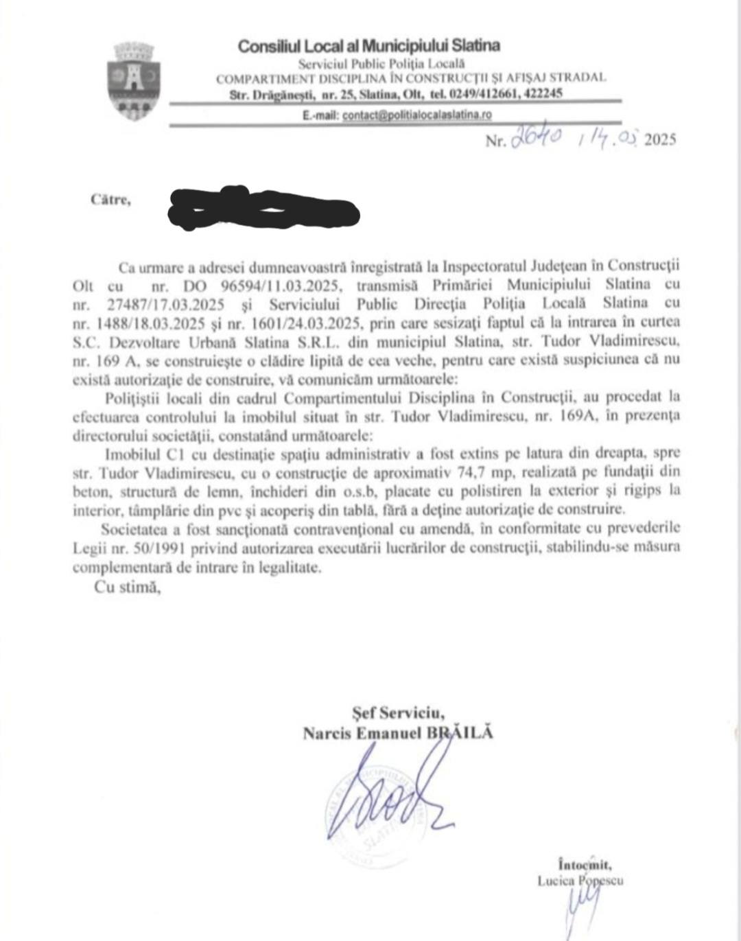 Dezvoltare Urbană Slatina, societatea din subordinea Primăriei Slatina, a fost amendată de Inspectoratul de Stat în Construcţii, după ce a extins ilegal sediul de pe strada Tudor Vladimirescu.