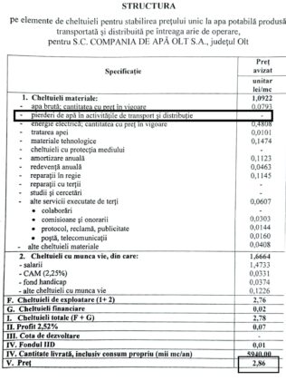 Dacă n-am avut de la Consiliul de Administrație un document din care să rezulte că pierderea este inclusă în preț și care este cadrul legal prin care fac această reducere, am cerut Asociației de Dezvoltare Intercomunitară ADI Oltul, documentația prin care a fost aprobat prețul apei de către ANRSC. Și surpriză, ce să vedeți! În prețul apei nu este inclusă pierderea de reţea. Prețul apei este format doar din altceva și vă rog să arătăm documentele.