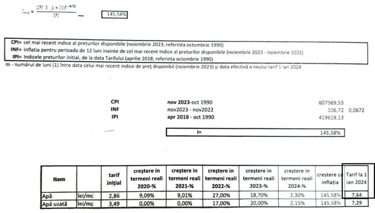 Deci primul document spune în felul următor. Dacă vă uitați la cheltuieli materiale a doua liniuță, arată că pierderea de apă în activități de transport și distribuție în prețul total este zero. La final se constituie prețul apei care înseamnă 2,86. Ăsta este prețul apei, vă rog la documentul următor, avizat de către Autoritatea Națională de Reglementare pentru Servicii Comunitare de Utilități Publice în 16.03.2018. Deci vedeți acolo joc, prețul apei aprobat de către ANRSC este de 2,86, așa cum se vede și din documentul anterior.