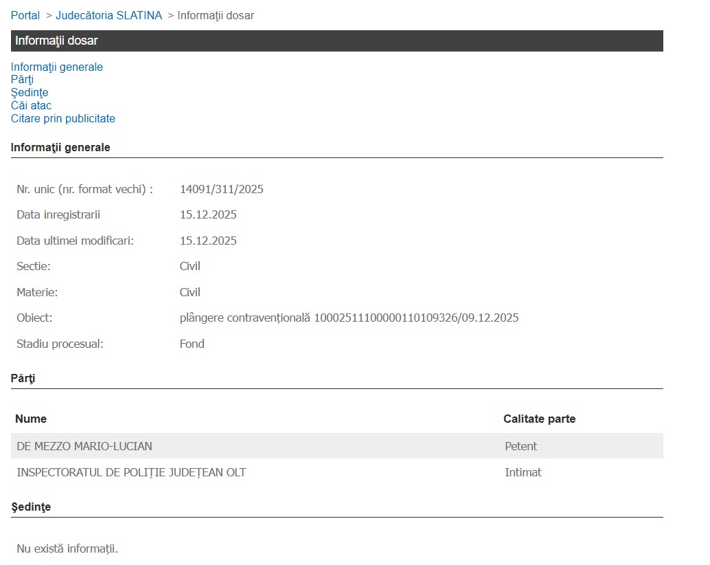 Mai mult, De Mezzo a contestat în instanţă sancţiunea aplicată prin sistemul „e-SIGUR”. Potrivit portalului oficial al Judecătoriei Slatina, plângerea contravenţională a edilului a fost înregistrată în data de 15 decembrie. Între timp, până la o pronunţare definitivă a instanţei, De Mezzo poate să conducă.