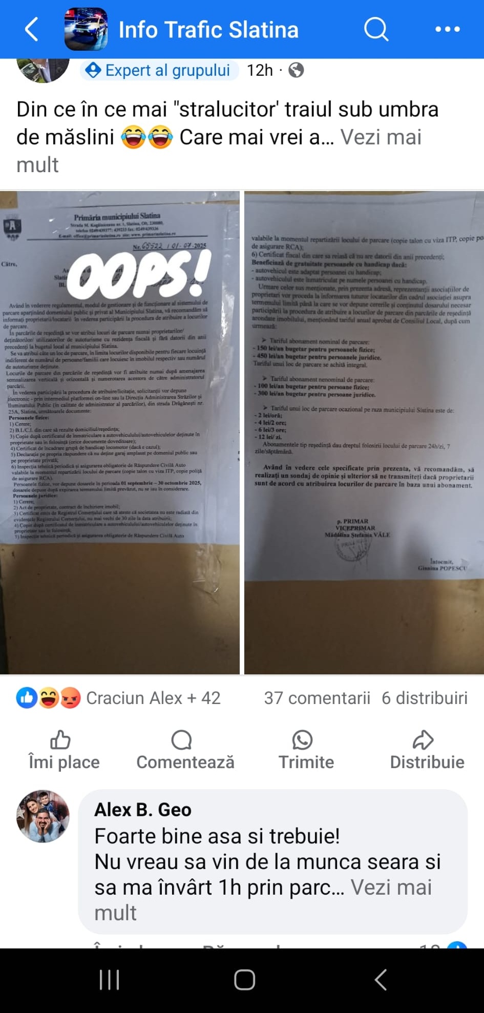 Documentul, care viza consultarea cetățenilor în legătură cu oportunitatea introducerii unui sistem de parcări cu plată, a fost însoțit de glume și comentarii tăioase pe Facebook din partea edilului-şef, sugerând că acțiunea ar fi fost o gafă administrativă. De fapt, primarul ştia foarte bine despre ce este vorba.