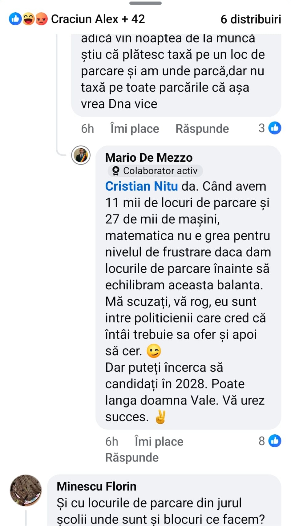 „Când avem 11 mii de locuri de parcare şi 27 de mii de maşini, matematica nu e grea pentru nivelul de frustrare daca dam locurile de parcare înainte så echilibram aceasta balanta. Mă scuzaţi, vă rog, eu sunt intre politicienii care cred că întâi trebuie sa ofer şi apoi să cer. Dar puteți încerca să candidaţi în 2028. Poate lângă doamna Văle. Vă urez succes”, a mai comentat primarul.