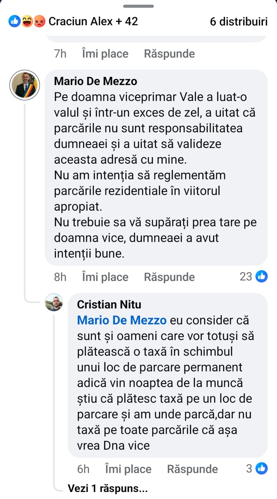 „Pe doamna viceprimar Văle a luat-o valul şi într-un exces de zel, a uitat că parcările nu sunt responsabilitatea dumneaei şi a uitat să valideze aceasta adresă cu mine.