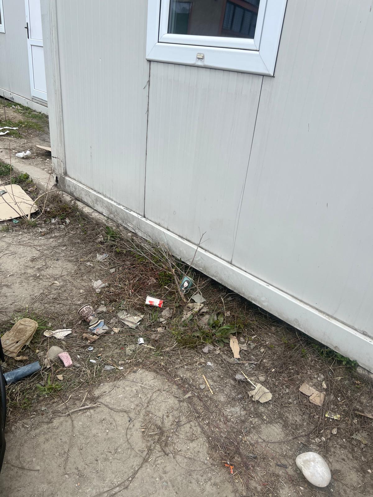 Mai mult, mizeria este prezentă la fiecare pas. Fotografiile arată mormane de gunoaie menajere, PET-uri, cartoane și anvelope abandonate chiar lângă pereții containerelor. Lipsa pubelelor și a unui sistem de colectare a deșeurilor a transformat perimetrul într-o zonă insalubră. Această stare de fapt atrage haite de câini fără stăpân, care caută hrană printre resturi, punând în pericol siguranța celor evacuați. Într-una dintre imagini se observă chiar animale hrănite rudimentar sub structurile de beton ale ruinelor vecine, confirmând prezența constantă a maidanezilor în imediata apropiere a ușilor de acces.