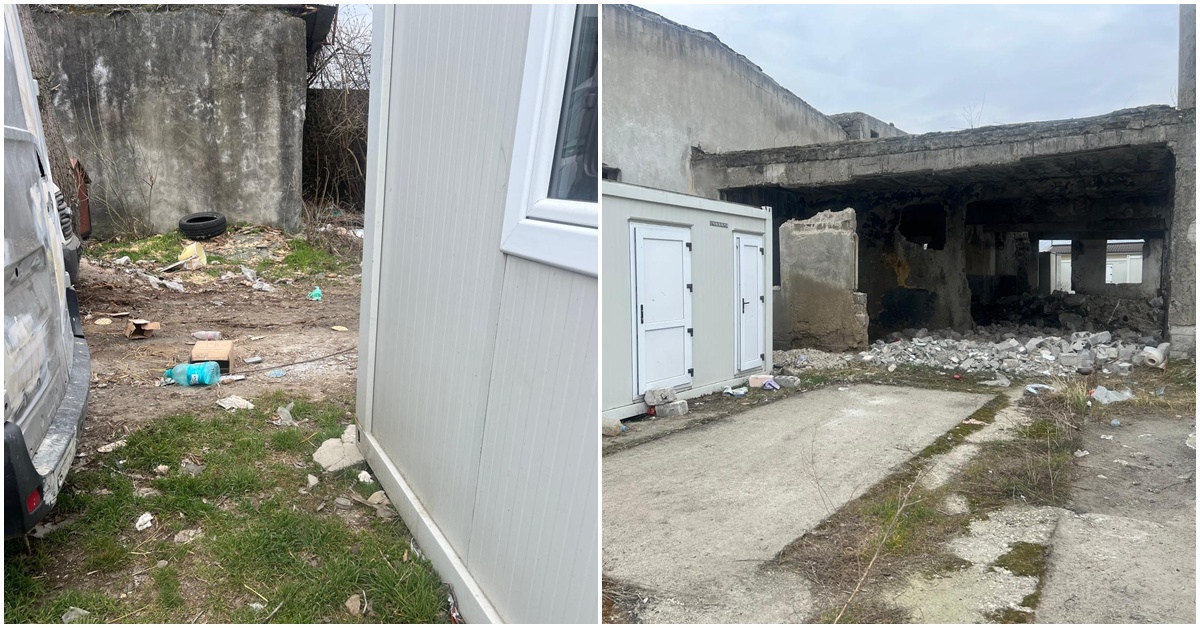Mai mult, mizeria este prezentă la fiecare pas. Fotografiile arată mormane de gunoaie menajere, PET-uri, cartoane și anvelope abandonate chiar lângă pereții containerelor. Lipsa pubelelor și a unui sistem de colectare a deșeurilor a transformat perimetrul într-o zonă insalubră. Această stare de fapt atrage haite de câini fără stăpân, care caută hrană printre resturi, punând în pericol siguranța celor evacuați. Într-una dintre imagini se observă chiar animale hrănite rudimentar sub structurile de beton ale ruinelor vecine, confirmând prezența constantă a maidanezilor în imediata apropiere a ușilor de acces.