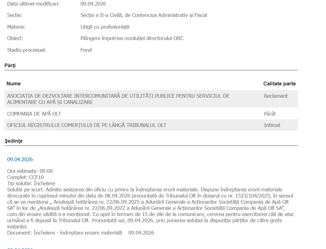 Asociaţia de Dezvoltare Intercomunitară (ADI) de Utilități Publice pentru Serviciul de Alimentare cu Apă şi Canalizare a certu în instanţă anularea hotărârii nr. 22/06.09.2022 a Adunării Generale a Acţionarilor Societăţii Compania de Apă Olt SA prin care s-au prelungit mandatele membrilor din Consiliul de Administraţie.