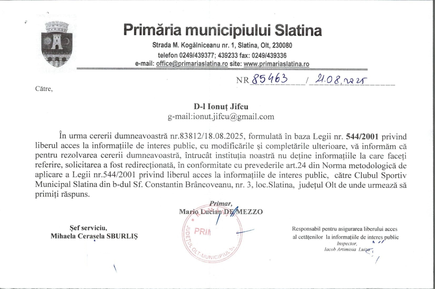 „În urma cererii dumneavoastră nr.83812/18.08.2025, formulată în baza Legii nr. 544/2001 privind liberul acces la informațiile de interes public, cu modificările şi completările ulterioare, vă informăm că pentru rezolvarea cererii dumneavoastră, întrucât instituția noastră nu deține informațiile la care faceți referire, solicitarea a fost redirecționată, în conformitate cu prevederile art.24 din Norma metodologică de aplicare a Legii nr.544/2001 privind liberul acces la informațiile de interes public, către Clubul Sportiv Municipal Slatina din b-dul Sf. Constantin Brâncoveanu, nr. 3, loc.Slatina, județul Olt de unde urmează să primiți răspuns”, a transmis Primăria Slatina.