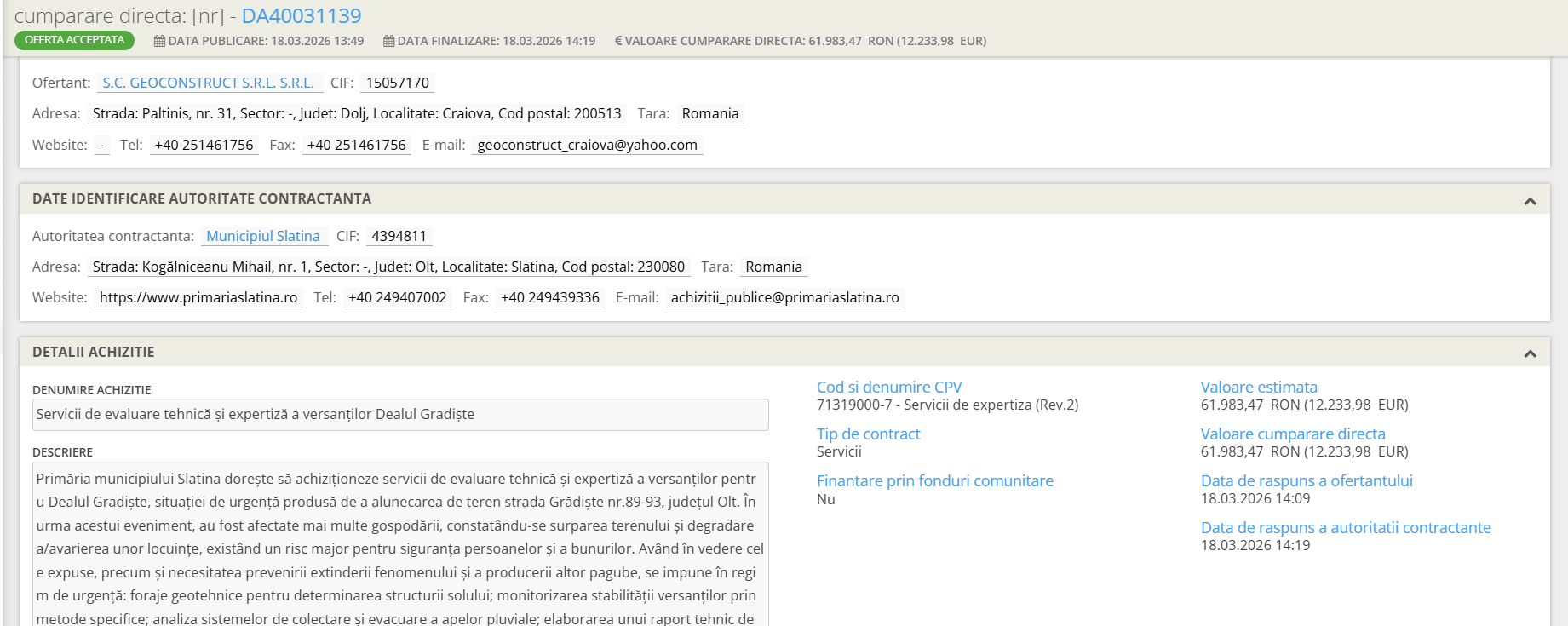 „Primăria municipiului Slatina dorește să achiziționeze servicii de evaluare tehnică și expertiză a versanților pentru Dealul Gradiște, situației de urgență produsă de a alunecarea de teren strada Grădiște nr.89-93, județul Olt. În urma acestui eveniment, au fost afectate mai multe gospodării, constatându-se surparea terenului și degradarea/avarierea unor locuințe, existând un risc major pentru siguranța persoanelor și a bunurilor. Având în vedere cele expuse, precum și necesitatea prevenirii extinderii fenomenului și a producerii altor pagube, se impune în regim de urgență: foraje geotehnice pentru determinarea structurii solului; monitorizarea stabilității versanților prin metode specifice; analiza sistemelor de colectare și evacuare a apelor pluviale; elaborarea unui raport tehnic de expertiză; propunerea de soluții tehnice pentru consolidare și stabilizare (după caz)”, se arată pe SEAP.