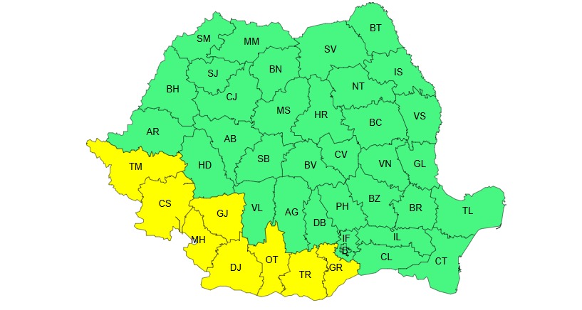 În Banat, cea mai mare parte a Olteniei și în sud-vestul Munteniei se vor înregistra temperaturi deosebit de ridicate pentru această dată, va fi disconfort termic ridicat, iar indicele temperatură-umezeală (ITU) va depăși ușor pragul critic de 80 de unități. Temperaturile maxime vor fi cuprinse între 33 și 36 de grade.