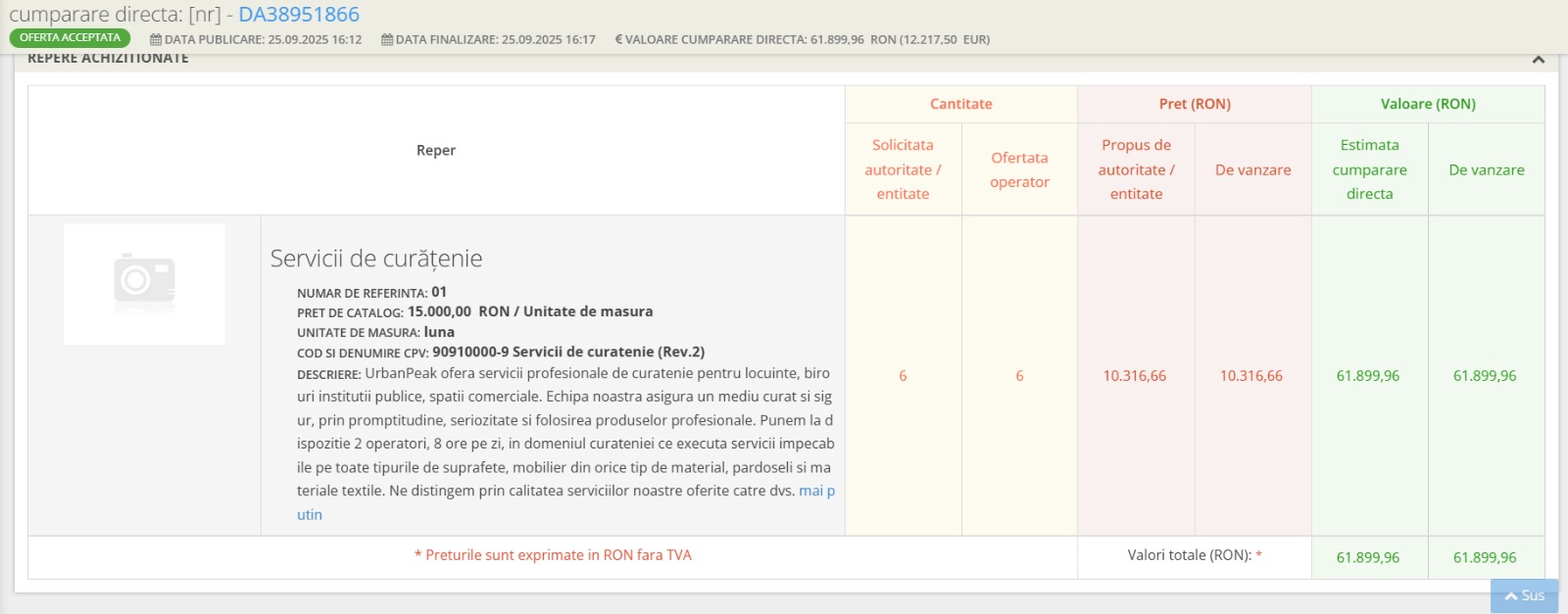 Valoarea contractului se cifrează la 61.899,96 lei (12.217,50 euro), potrivit SICAP.