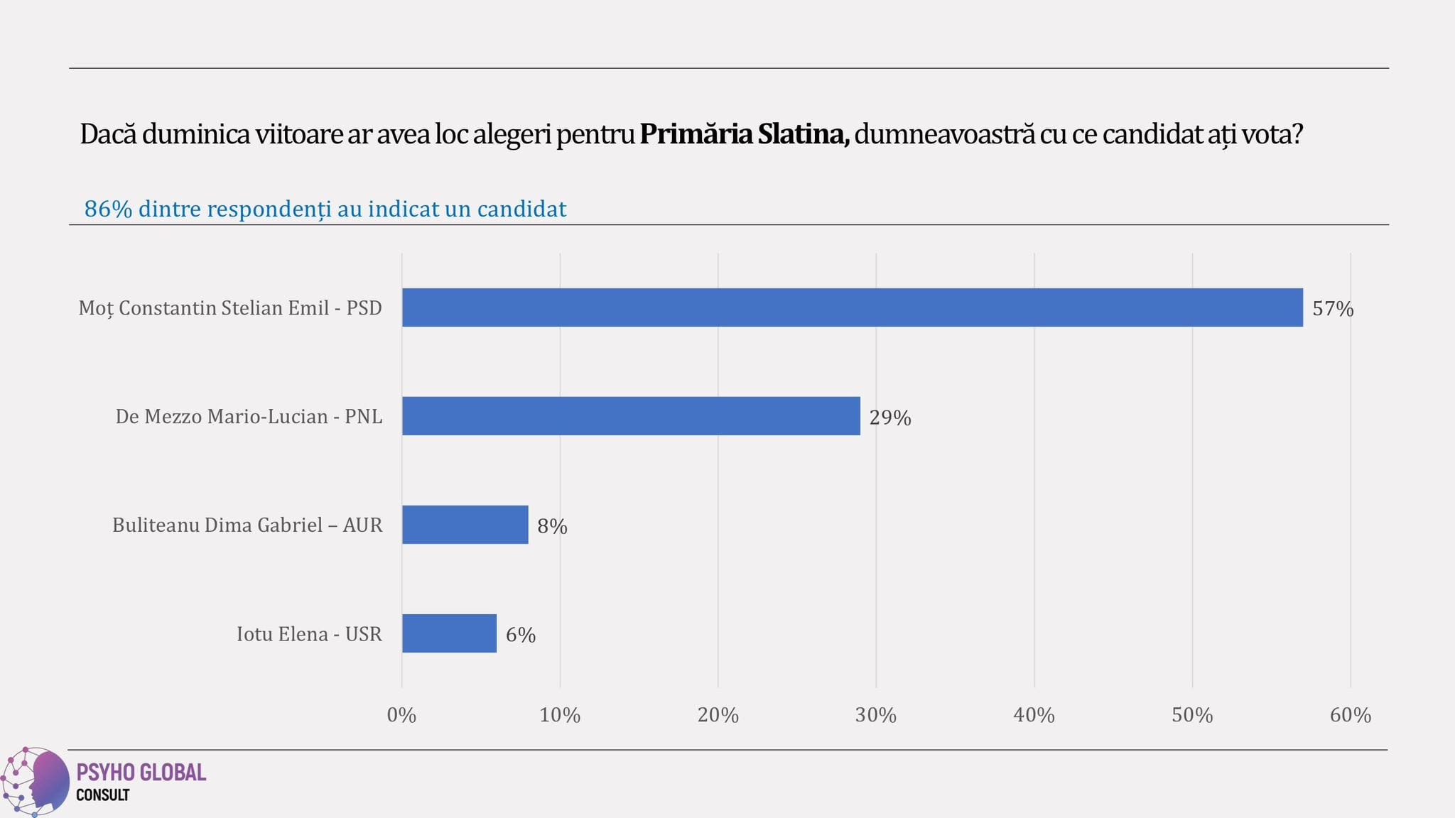 În sondajul citat, Emil Moţ are 57%, în timp ce candidatul PNL are 29%. Pe locul trei se clasează candidatul AUR, Gabriel Buliteanu, cu 8%, urmat de Elena Iotu (USR-Alianţa Dreapta Unită), cu 6%.