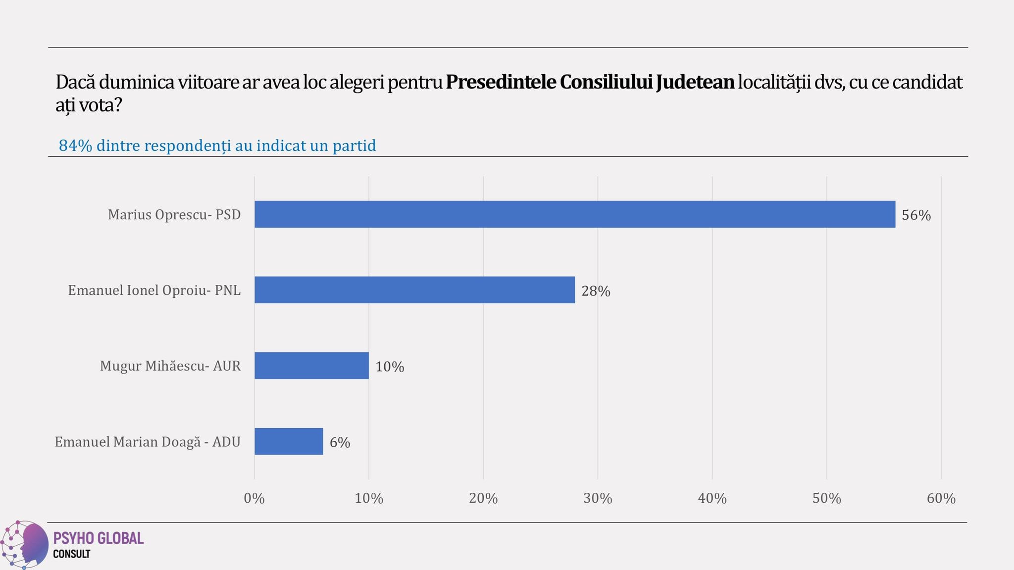 PSD domină preferinţele alegătorilor şi în ceea ce priveşte alegerile pentru şefia Consiliului Judeţean Olt: Marius Oprescu (PSD) – 56%, Emanuel Opriu (PNL) – 28%, Mugur Mihăescu (AUR) – 10%, Emanuel Doagă (ADU)- 6%.