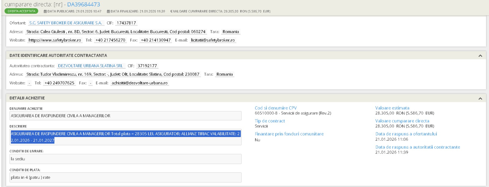 Dezvoltare Urbană Slatina (DUS), firma din subordinea Consiliului Local, a achiziţionat miercuri o poliţă ce vizează „Asigurarea de răspundere civilă a managerilor“. Achiziţia s-a făcut după reţeta brevetată de când Primăria Slatina a fost preluată de actualul edil, Mario De Mezzo, adică prin achiziţie directă, şi a costat 28.305 lei (5.586,70 euro).