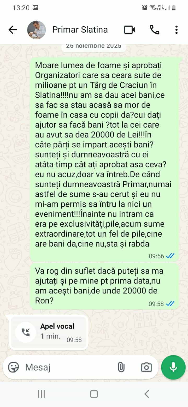 Primăria Slatina plăteşte peste 53.000 euro, pentru organizarea Târgului de Crăciun, unei firme deţinute de mama unui coleg de partid al primarului Mario De Mezzo. Este vorba de Alin Călinescu, fost candidat la Primăria Mioveni din Argeș, susţinut electoral de actualul edil din Slatina. Ca de obicei, achiziţia s-a făcut prin atriburire directă, dar şi offline, adică „la dos“, fiind postată pe SICAP la câteva zile după debutul târgului care va fi deschis până pe 16 ianuarie 2026. Între timp, comercianţii din târg se plâng de sumele exorbitante pe care organizatorul desemnat de primărie le cere, sume care depăşesc 3.000 de euro, fără TVA. Oamenii mai spun că, atunci când i-au semnalat situaţia primarului, au primit doar urlete şi indiferenţă.