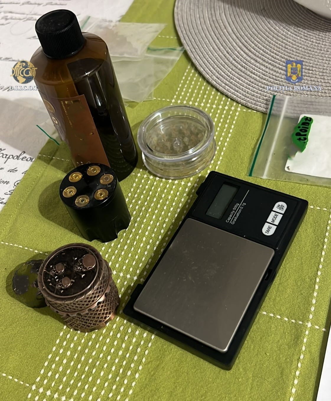 Mai multe recipiente, grindere și un cântar electronic de precizie, dar şi importante sume de bani au fost ridicate de poliţiştii şi procurorii DIICOT Craiova, în urma unor percheziţii desfăşurate, marţi, la locuinţele a doi tineri, în vârstăde 21 şi 22 de ani, ambii din Bănie. Între timp, ei au fost arestaţi preventiv.