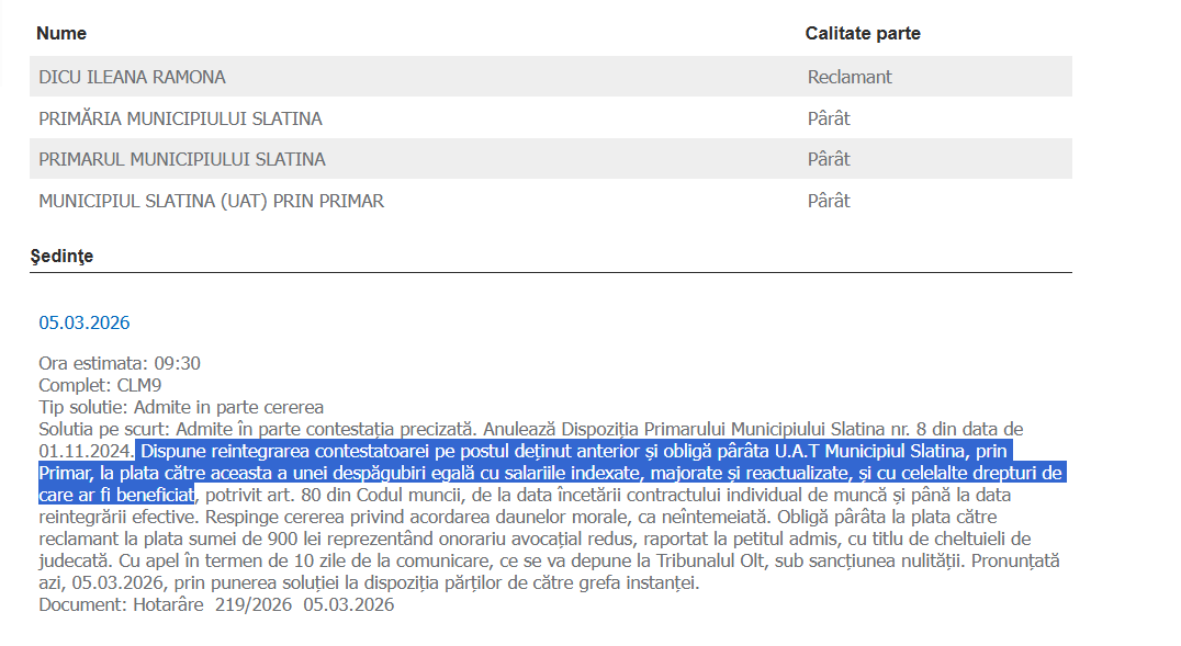 „Solutia pe scurt: Admite în parte contestaţia precizată. Anulează Dispoziţia Primarului Municipiului Slatina nr. 8 din data de 01.11.2024. Dispune reintegrarea contestatoarei pe postul deţinut anterior şi obligă pârâta U.A.T Municipiul Slatina, prin Primar, la plata către aceasta a unei despăgubiri egală cu salariile indexate, majorate şi reactualizate, şi cu celelalte drepturi de care ar fi beneficiat, potrivit art. 80 din Codul muncii, de la data încetării contractului individual de muncă şi până la data reintegrării efective. Respinge cererea privind acordarea daunelor morale, ca neîntemeiată. Obligă pârâta la plata către reclamant la plata sumei de 900 lei reprezentând onorariu avocaţial redus, raportat la petitul admis, cu titlu de cheltuieli de judecată. Cu apel în termen de 10 zile de la comunicare, ce se va depune la Tribunalul Olt, sub sancţiunea nulităţii. Pronunţată azi, 05.03.2026, prin punerea soluţiei la dispoziţia părţilor de către grefa instanţei”, se arată în încheierea instanţei.